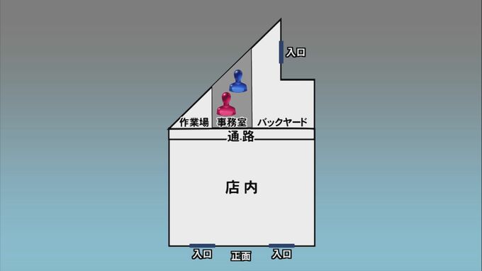 この店の事務室は、店の奥、バックヤードにありますが、犯人は店内を通らず、店の裏手にある出入口を使いました。