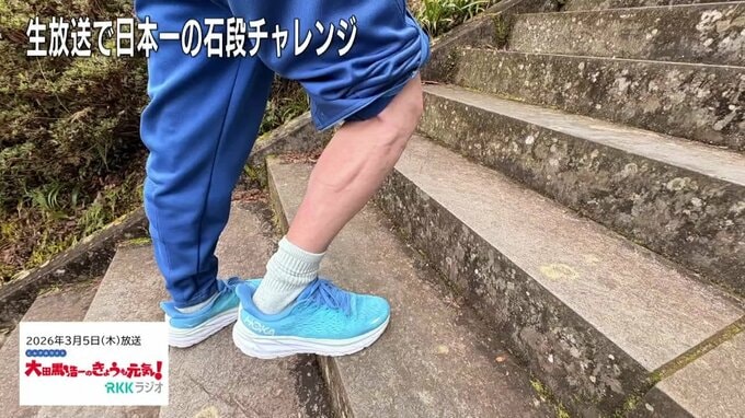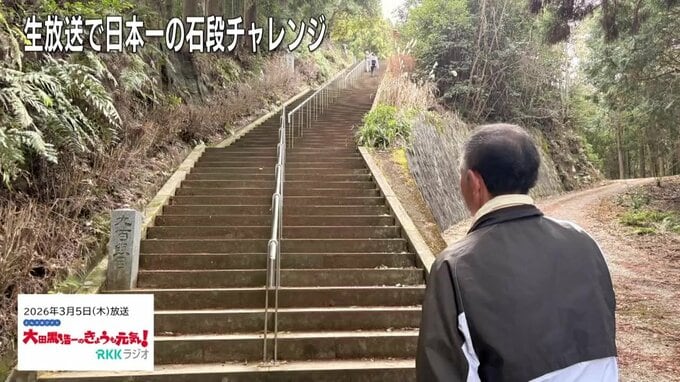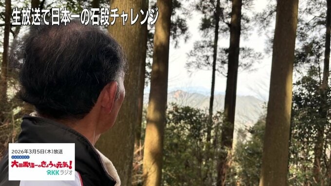 パーソナリティ: 古戝キャスターが美里町の3333段にチャレンジしようということで、今もう1時間ぐらい経ってきましたが、どうなんでしょうね。呼んでみましょう。古戝さーん!