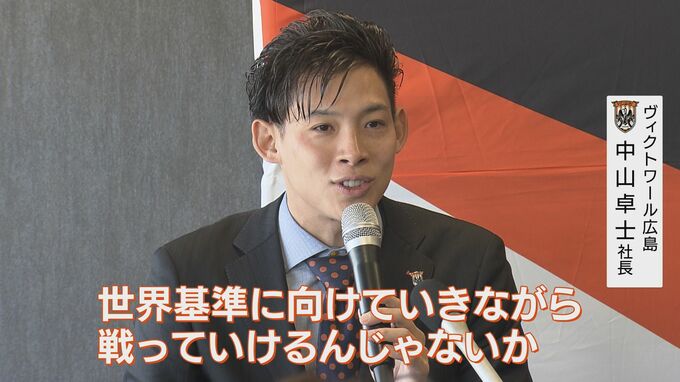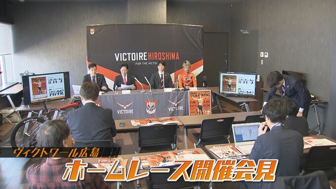 新しくなった広島競輪場で今月4日に行われたヴィクトワール広島の記者会見には中山卓士社長、西村大輝監督、昨年のクリテリウム王者・孫崎大樹、ネーミングスポンサーのマリモホールディングス深川真社長が出席しました。