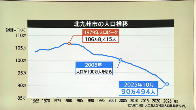 福岡県北九州市の人口は1979年には、106万人あまりで、当時は福岡市と並んでいました。しかし、いわゆる鉄冷えなど産業構造の変化などから減り続け2005年には100万人を割り今や90万人割れ目前です。