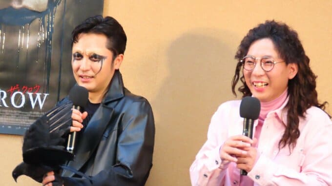 イベントには、赤木さんが主人公のエリック、きむらさんがヒロインのシェリーに扮装して登場しました。自身のビジュアルを赤木さんは〝(映画イベントは)初めての経験で、お化粧もさせていただいて〟と、喜びつつ、お互いを見て「見慣れるまでお互い半笑いだった」と告白。しかし、赤木さんは扮装したきむらさんを「ファーストサマーウイカさんに似ている」と思ったそうで、きむらさんは〝今まで言われた言葉の中で一番嬉しい。これから似ている芸能人はファーストサマーウイカさんと言っていこうと思います〟と胸を張りました。