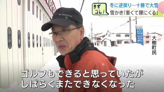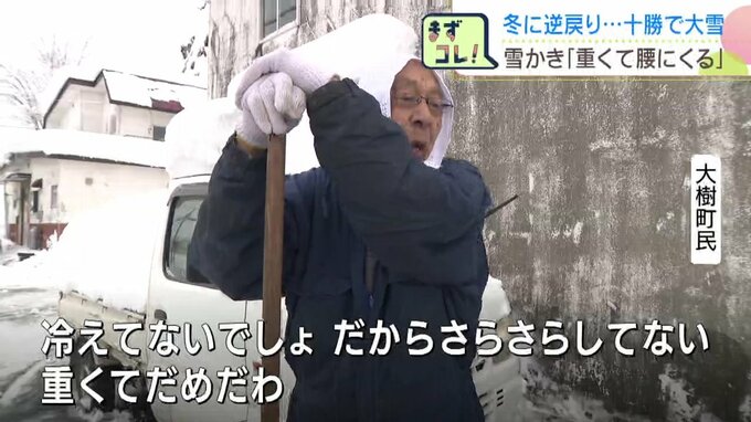 「1回(雪を)下ろした。下ろさなかったら、これの倍になってるわ。冷えてないでしょ、だからさらさらしてないの。だからだめだわ重くて、腰に来る」