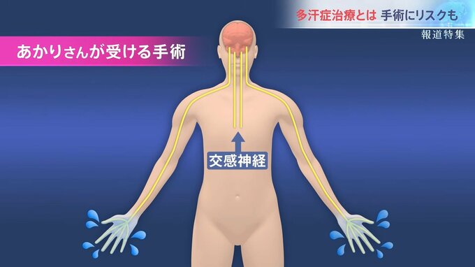 あかりさんが受けるのは、胸部の交感神経を遮断する手術だ。大量の手の汗は、交感神経から送り出された信号を受けて出るとされている。