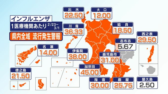 保健所別では多い順に、加世田が45.00、伊集院が38.00、川薩が36.33、鹿児島市が31.00、指宿が30.00、西之表が29.50、鹿屋が25.75、出水が22.50、徳之島が21.50、姶良が18.50、名瀬が14.00、大口が12.00、志布志が5.67、屋久島が2.50となっています。