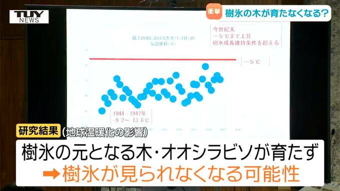 研究結果によりますと、地球温暖化で蔵王の平均気温が上がることで樹氷の元となる木・オオシラビソが育たなくなり、樹氷も見られなくなる可能性があるということです