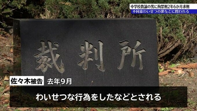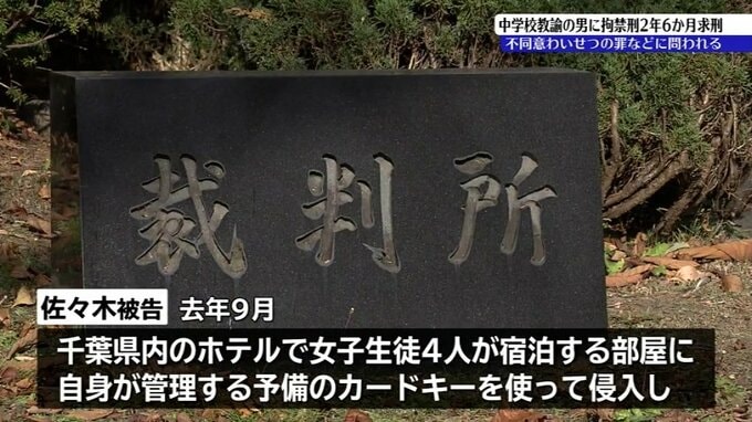 起訴状などによりますと、佐々木被告は2025年9月、勤務する中学校の修学旅行に学年主任として帯同し、千葉県のホテルで女子生徒4人が宿泊する部屋に自身が管理する予備のカードキーを使って侵入し、わいせつな行為をしたなどとされています。