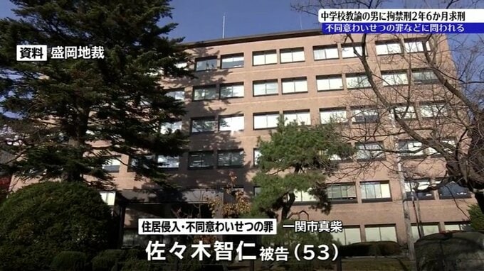 住居侵入と不同意わいせつの罪に問われているのは、岩手県奥州市の中学校の教諭で一関市真柴の佐々木智仁被告53歳です。