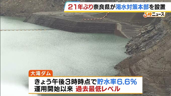奈良県は3月5日、渇水対策本部を設置し、明日から一部の地域で給水制限に向けた準備を行うと発表しました。 記録的な少雨の影響で、奈良県川上村の大滝ダムでは、ダムの貯水量が低下し、5日午後3時の時点で貯…
