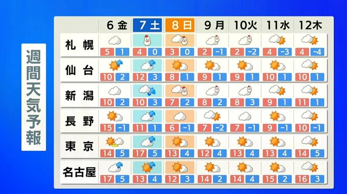 土曜日は各地で雨や雪が降り、日曜日は北陸から北の日本海側では雪が降るでしょう。最高気温は、土曜日は東京は17℃と4月上旬並みですが、日曜日は13℃と平年並みの気温に戻る予想です。