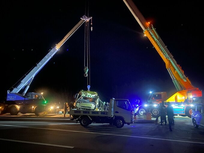 ダンプカーは事故の衝撃で道路の外へとはみ出して横転し、現場では5日夜までクレーン車でダンプカーを引き上げる作業が行われました。
