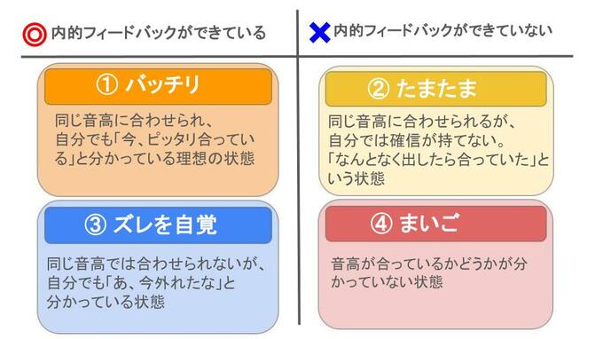 音高は合っているが、それは偶然の一致。まずは「音が合っている状態」を自分で認知できるよう、内的フィードバックを磨く必要がある。