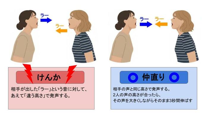 相手の声と同じ高さで発声する。2人の声の高さが合ったら、その声を大きくしながらそのまま3秒間伸ばす。
