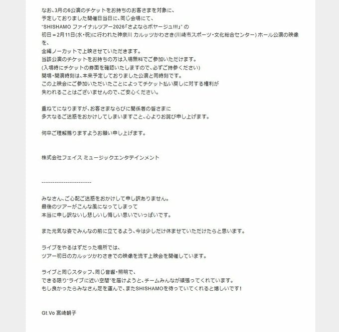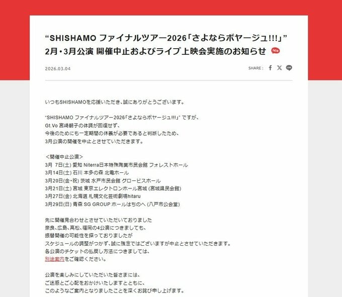 公式サイトでは「“SHISHAMO ファイナルツアー2026「さよならボヤージュ!!!」” ですが、Gt.Vo 宮崎朝子の体調が回復せず」「今後のためにも一定期間の休養が必要であると判断したため、3月公演の開催を中止とさせていただきます」と発表しました。