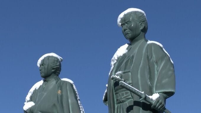 23日、観測史上最高となる14センチの積雪を観測した高知市。24日朝、水滴が垂れて凍りついた『つらら』が見られました。屋根や木々にも雪が残り、南国・土佐はまるで雪国のようです。JR高知駅前にある坂本龍馬、中岡慎太郎、武市半平太の三志士像もご覧の姿に。坂本龍馬も驚きの雪景色です。