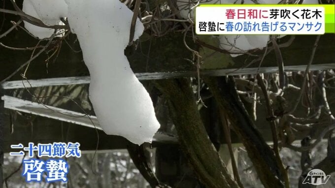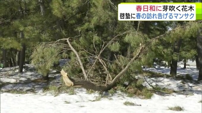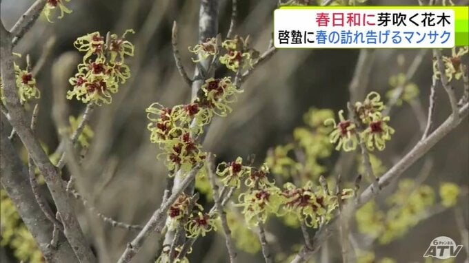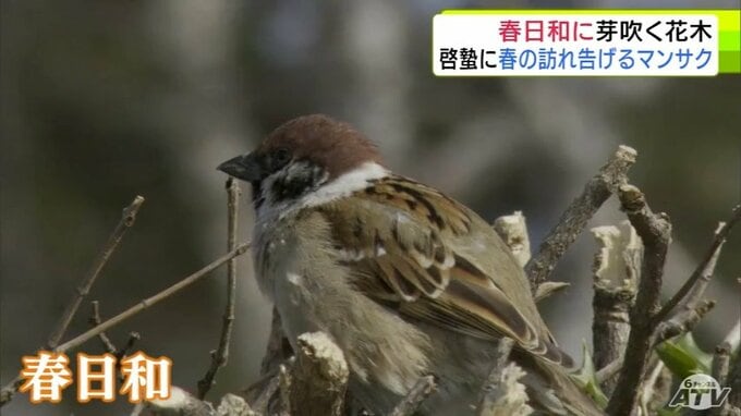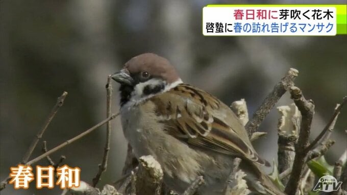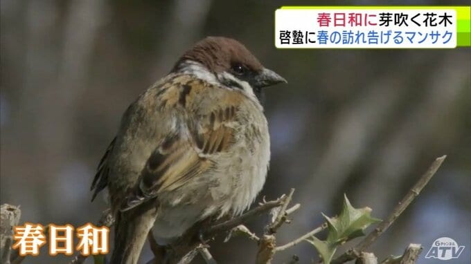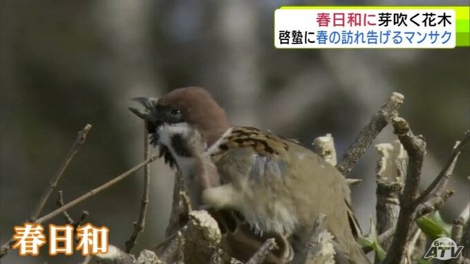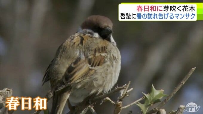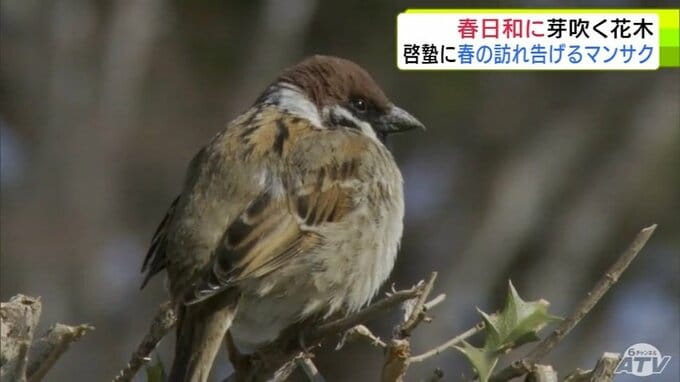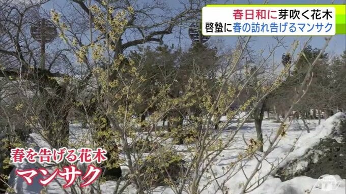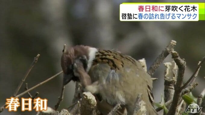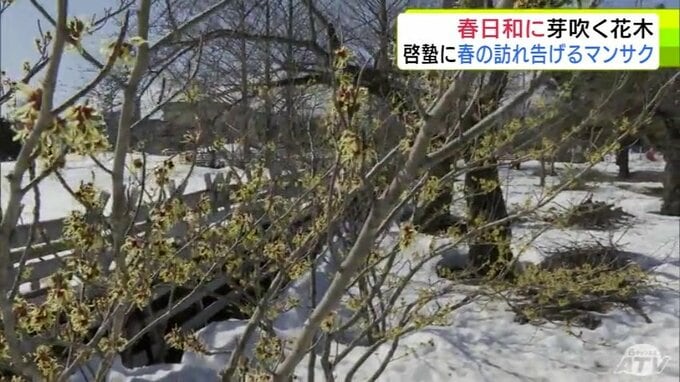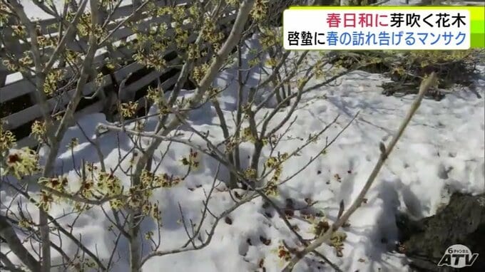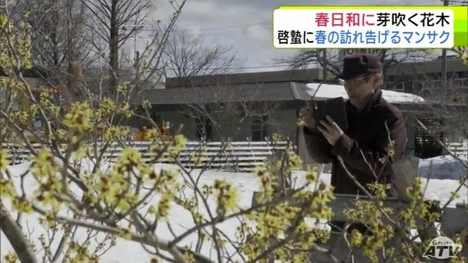 青森市にも春の息吹 穏やかな春日和で「マンサク」咲き始めスズメものんびり 雪も徐々に溶け始め季節は一歩ずつ春へ 合浦公園