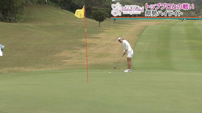 ダイキン工業所属の新垣比菜(27)は、スタートホールの1番、Tショットが大きく外れる波乱のスタート。しかし3打目で見事ピンそばに付けるナイスリカバリーでこのホールをパーでしのぎます。