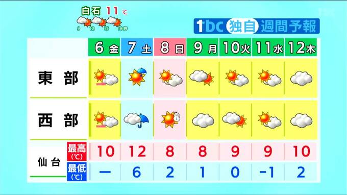 【6日宮城の天気】日中は穏やかも夜から雨 “折りたたみ傘”あると安心 週末は強風と花粉の大量飛散に注意 tbc気象台 東北放送 2026年3月6日(金) 11:45 国内 天気 【週間予報】 気温は土曜日まで平年より高いですが、日曜日以降は平年並みとなります。震災発生から15年となる水曜日は穏やかな天気となる見込みです。