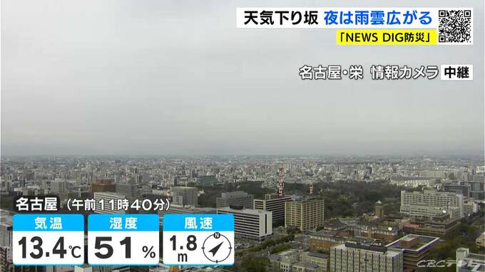 正午前の名古屋市内は、雲が多く出ています。気温は13.4℃で、きのうより風は穏やかです。