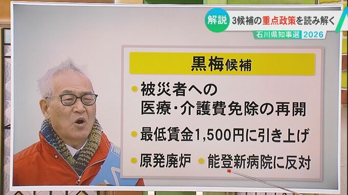 黒梅候補は、能登半島地震の被災者への医療・介護費免除の再開、最低賃金1500円への引き上げによる中小企業支援、そして、志賀原発の廃炉を訴えます。