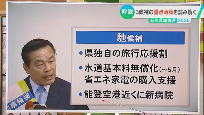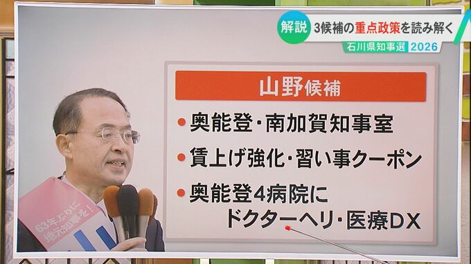 山野之義候補は、金沢市長や民間企業での経験を生かし、奥能登と南加賀に常設の知事室を設置するなど「現場目線」の県政を訴えます。
