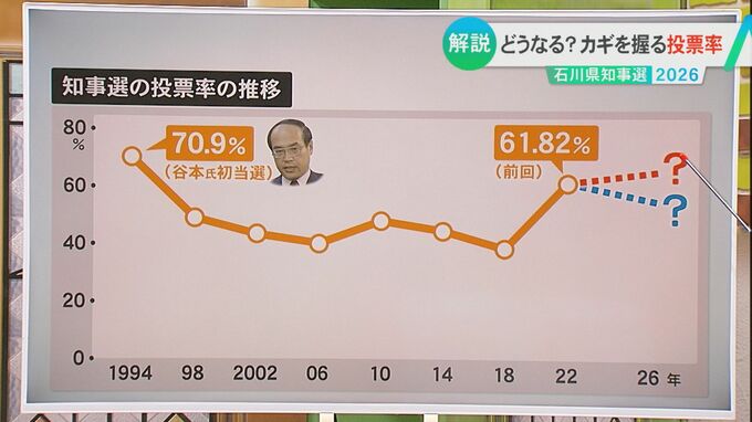 地震の影響で、都市部よりも投票率が高い能登地域の人口が減っていることを踏まえ、57%まで落ち込むとの陣営の見方もあれば、期日前の投票率が堅調に推移していることから、前回を超える65パーセントまで伸びるのではないかとの見立てもあります。