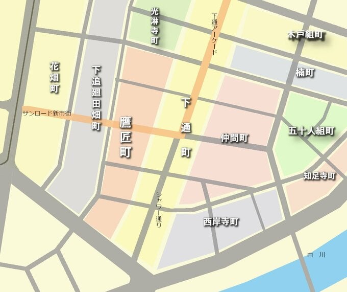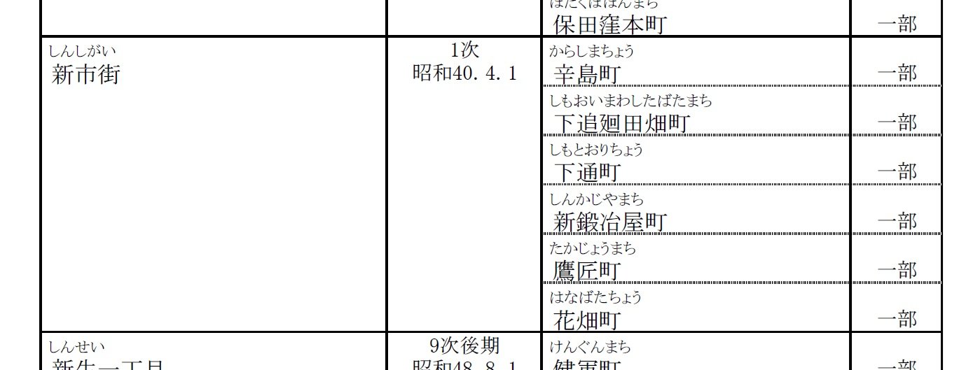 現在「新市街」という町名なっているこの一帯は、1965年(昭和40年)の住居表示改正までは、たくさんの小さな町に分かれていました。