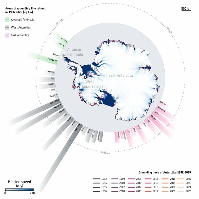 最も大規模な後退は大陸の「西南極(グレーの帯)」側に集中しているほか、南極半島(緑色)や東南極(ピンク色)の海岸沿いでも大幅な後退が確認できます。