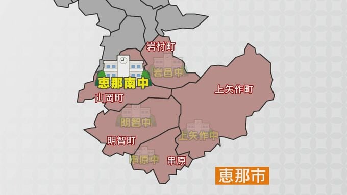 その南部には、串原をはじめ山岡・岩村・明智・上矢作の5つの市立中学校がありますが、4月からは5つの学区が一つになり、新しく恵那南中学校に統合されます。このため、名古屋市よりも広い、330平方キロメートル以上の学区に、中学校は1校だけになるのです。
