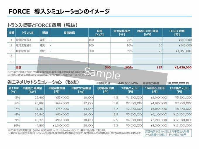 この導入シミュレーションは、「電気利用明細(直近12ヶ月分)・電気設備点検報告書(月次版の直近12ヶ月分)・単線結線図」の3点をNTT DXパートナーに共有するだけで作成が可能となる。シミュレーション内には、電気利用料金や温室効果ガスの削減期待値が試算されるほか、FORCE導入に伴うROI(投資回収年数)や設備耐用年数にあたる15年間での総コスト削減額も推計されるため、エネルギーコストを削減するための投資判断を検討するのに役立っているという。また、お客さまの要望があった際にはFORCEの提案だけではなく、他の省エネソリューションや電力プランによるコストシミュレーションも併せて実施をするほか、脱炭素経営を進めるにあたっての各種相談(計画策定、社員教育など)も受けることができるという。