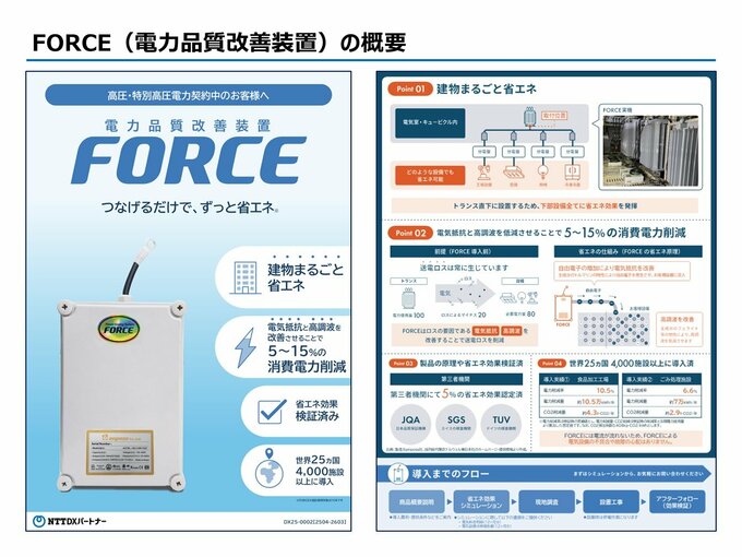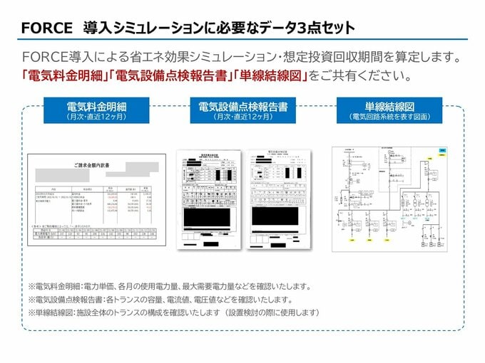 この導入シミュレーションは、「電気利用明細(直近12ヶ月分)・電気設備点検報告書(月次版の直近12ヶ月分)・単線結線図」の3点をNTT DXパートナーに共有するだけで作成が可能となる。シミュレーション内には、電気利用料金や温室効果ガスの削減期待値が試算されるほか、FORCE導入に伴うROI(投資回収年数)や設備耐用年数にあたる15年間での総コスト削減額も推計されるため、エネルギーコストを削減するための投資判断を検討するのに役立っているという。また、お客さまの要望があった際にはFORCEの提案だけではなく、他の省エネソリューションや電力プランによるコストシミュレーションも併せて実施をするほか、脱炭素経営を進めるにあたっての各種相談(計画策定、社員教育など)も受けることができるという。
