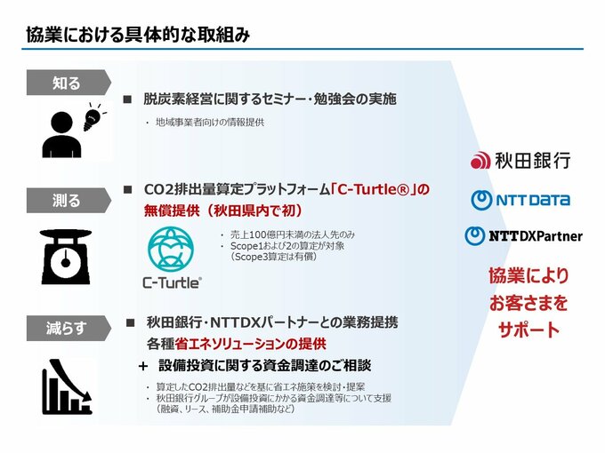 秋田銀行とNTT東日本グループは、2025年10月から地域企業の脱炭素経営を支援する連携を開始し、持続可能な地域社会のさらなる発展に向けた取り組みを展開している。NTT東日本グループが提供している省エネソリューション「FORCE」を中心とした企業のコスト削減に資する提案や、NTTデータが提供している企業のCO2排出量を可視化するシステム「C-Turtle®」(シータートル)を軸にした脱炭素経営の支援を進める両社に、連携に至った背景や取り組みの現状、そして今後の展望について聞いた。