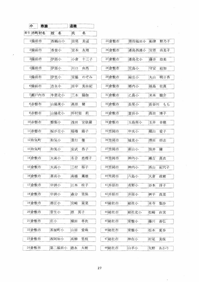 岡山県 教職員人事異動2026「あの先生は、どこへ?」(岡山市以外)【小学校・名簿一覧掲載・検索/令和8年度】 RSK山陽放送 2026年3月26日(木) 09:08 国内 名簿 名簿一覧画像 【小学校】 【中学校】 【高校/義務】