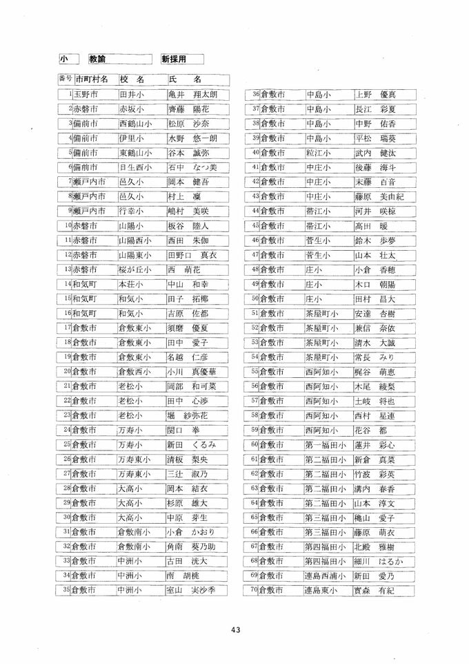 岡山県 教職員人事異動2026「あの先生は、どこへ?」(岡山市以外)【小学校・名簿一覧掲載・検索/令和8年度】 RSK山陽放送 2026年3月26日(木) 09:08 国内 名簿続き 名簿一覧画像 【小学校】 【中学校】 【高校/義務】