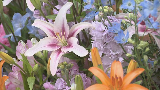 ことしは県オリジナル品種のユリ「プチシリーズ」やカーネーションなどの花束が贈られました。