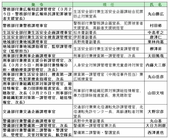 長野県警定期人事異動 第1次異動(次長級以上警察官・管理幹級以上警察行政職員)【名簿・写真掲載】14警察署長が交代 警察学校長に初の女性 信越放送 2026年3月6日(金) 16:51 国内 第1次異動名簿④