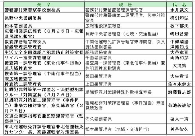 長野県警定期人事異動 第1次異動(次長級以上警察官・管理幹級以上警察行政職員)【名簿・写真掲載】14警察署長が交代 警察学校長に初の女性 信越放送 2026年3月6日(金) 16:51 国内 第1次異動名簿⑤