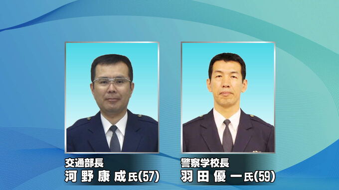 交通部長に河野康成氏(57)。警察学校長に羽田優一氏(59)。新設されたトクリュウ対策の司令塔ポストとして、刑事部総括参事官兼警務部総括参事官兼生活安全部総括参事官兼交通部総括参事官兼警備部総括参事官に藤澤剛氏(58)が就任します。