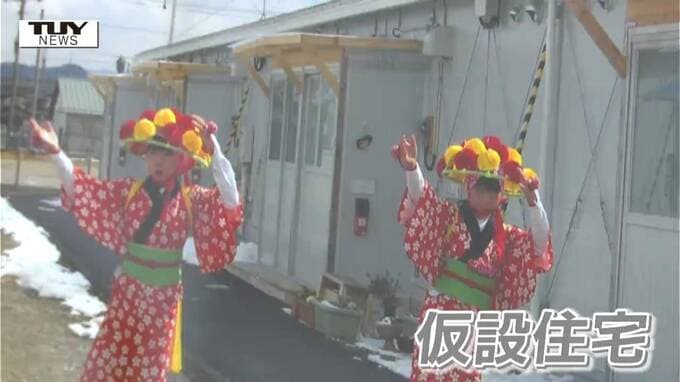 華やかな祭りの衣装を身にまとい、田植え踊りを踊る子どもたち。後ろに広がるのは仮設住宅です。