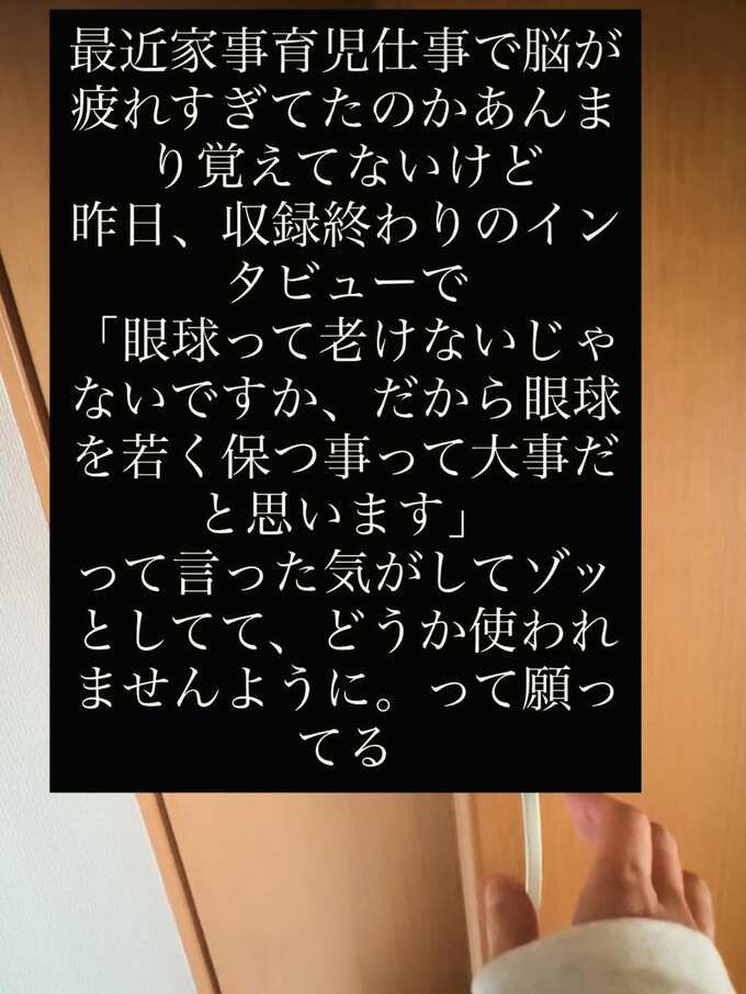 そして「昨日、収録終わりのインタビューで」「『眼球って老けないじゃないですか、だから眼球を若く保つ事って大事だと思います』って言った気がしてゾッとしてて」と、謎発言をしてしまった自分に気づいて愕然。