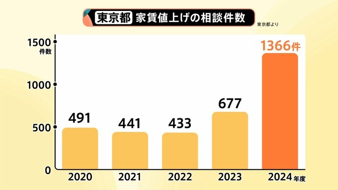 そうした中、家賃の値上げに関する相談件数も増えてきています。2024年度で1366件と、前年度(2023年度)と比べるとほぼ倍増しています。