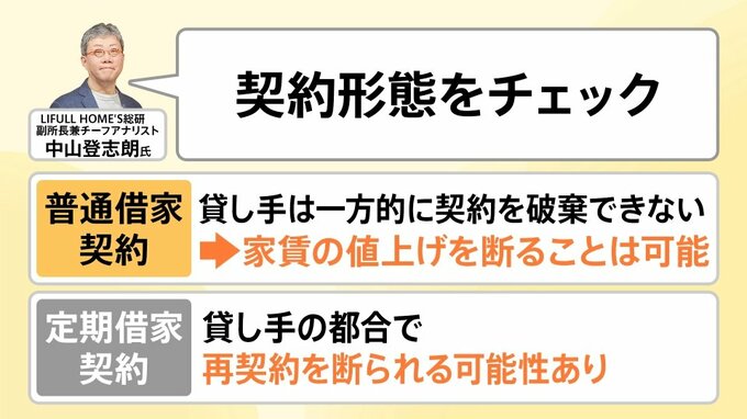LIFULL HOME'S総研の副所長兼チーフアナリストの中山登志朗氏は「契約形態をチェックしてほしい」としています。契約により大きな違いがあるということです。