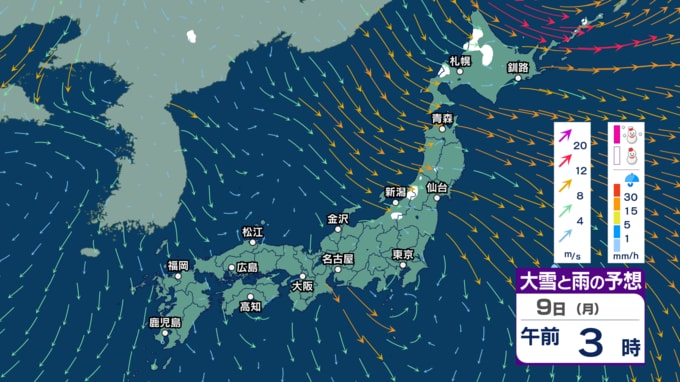 3. 土日は“冬の嵐”に? 寒気流入で北日本~東日本日本海側で大雪か 風も強まり東北では暴風の恐れ 海は大しけに? 【3時間ごとの雨雪と風のシミュレーション・6日午後9時更新】