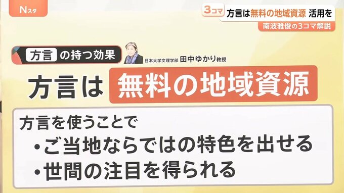 日本大学文理学部の田中ゆかり教授は「方言は無料の地域資源」と話します。