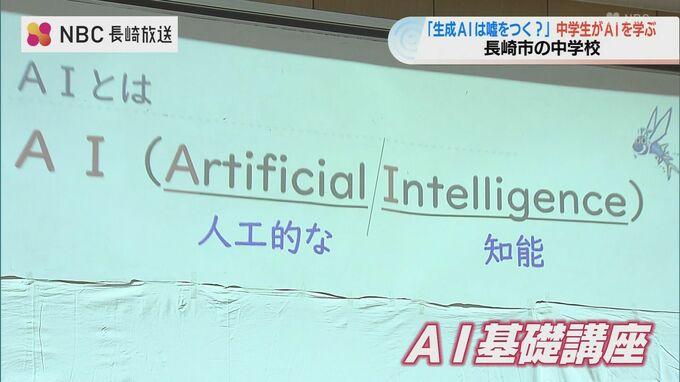 長崎市の小江原中学校で行われた「AI」の授業。小江原中では昨年度から佐世保高専と連携し工学に関する特別授業を開いていて、「AI時代」に生きる中学2年生81人がChatGPTなども利用し「AI」の原理を学びました。