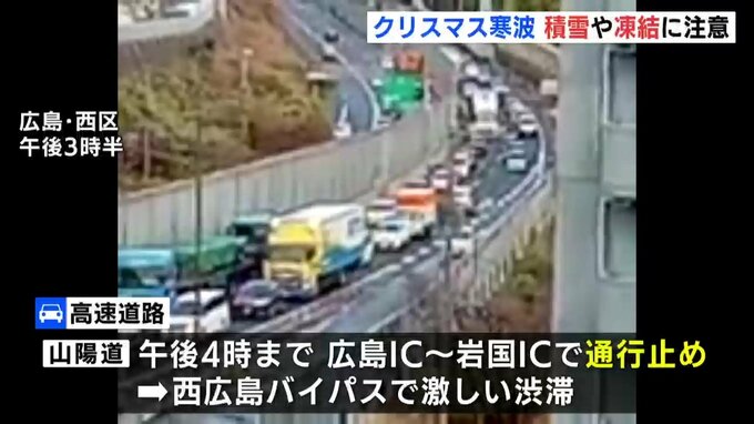 高速道路も山陽道が、午後4時まで広島インターチェンジと岩国インターチェンジの間で通行止めとなり、西広島バイパスで激しい渋滞が発生しました。