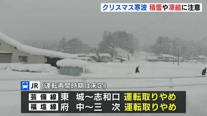 雪の影響で、JRは芸備線の東城から志和口の間、福塩線の府中から三次の間で、終日運転を取りやめています。運転再開の時期は、未定だとしています。