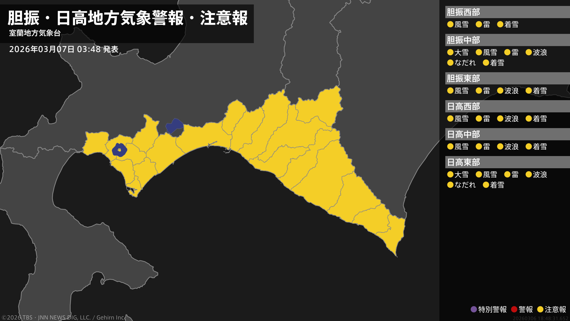 気象台は、午前3時48分に、なだれ注意報を室蘭市、苫小牧市、登別市、白老町、えりも町に発表しました。