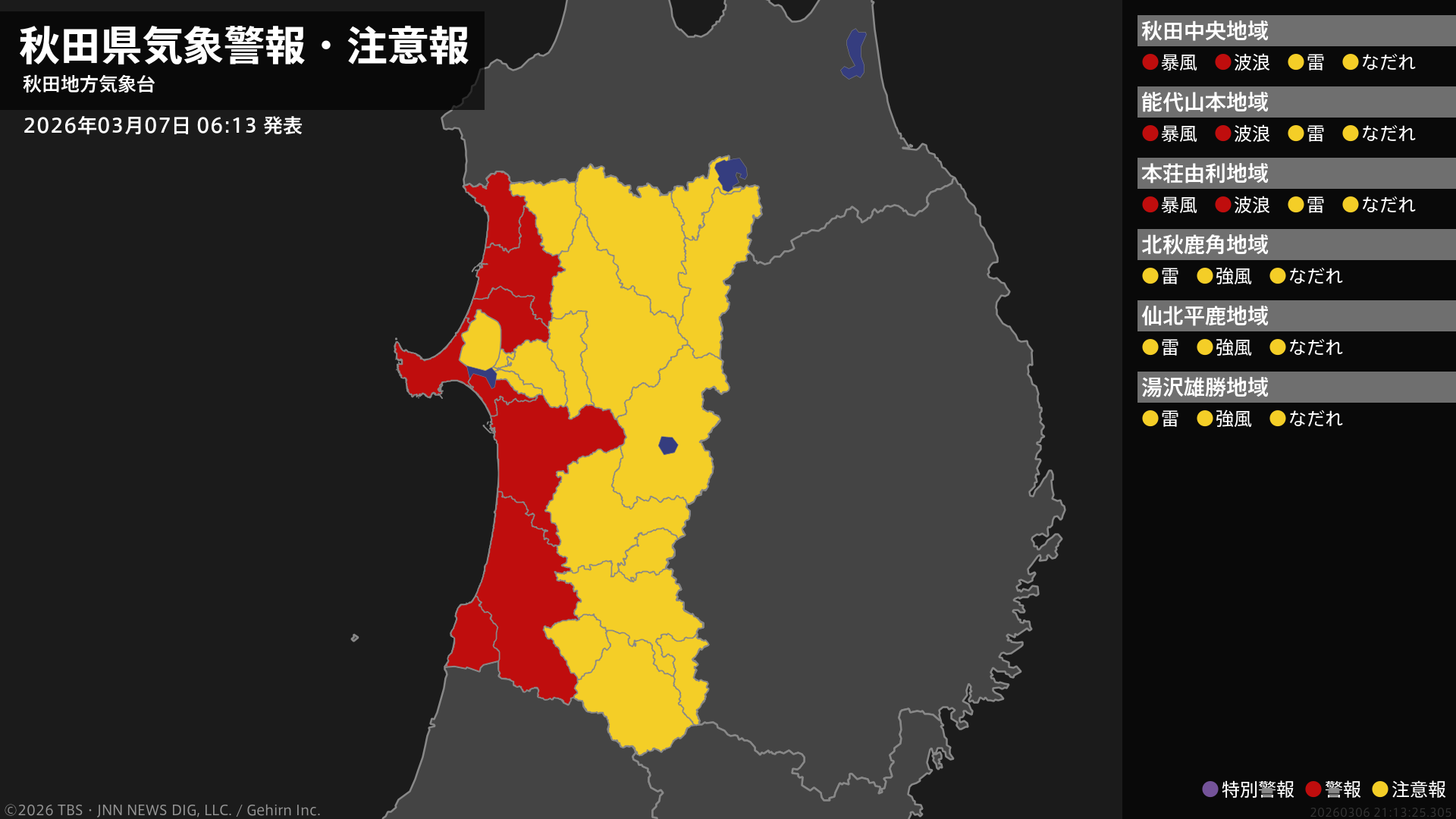 気象台は、午前6時13分に、波浪警報を秋田市、能代市、男鹿市、由利本荘市、潟上市、にかほ市、三種町、八峰町に発表しました。