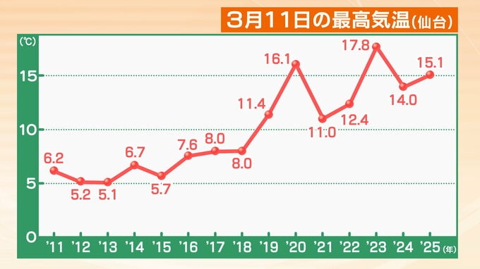 また、上空の寒気がやや強めのため、気温はあまり大きくは上がらず、最高気温はほぼ平年並みで仙台で9度、岩手県の宮古で6度の予想です。毎年3月11日の仙台の最高気温は下のグラフのとおりで、震災後しばらくは寒い年が続きましたが2019年以降は毎年平年を上回っています(平年値は9.0度)。2026年の3月11日は久しぶりに寒く感じられるかもしれません。