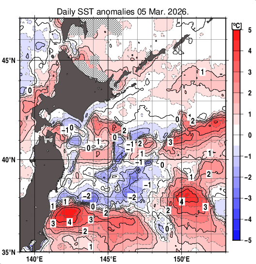 3月前半は海面水温が一年で最も低い時期ですが、宮城県沖の海面水温は平年よりやや低くなっているため、その上の空気も冷やされているとみられ、午後2時46分頃も冷たい海風となりそうです。暖かい服装をご用意ください。